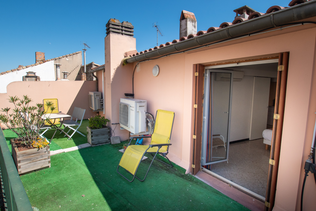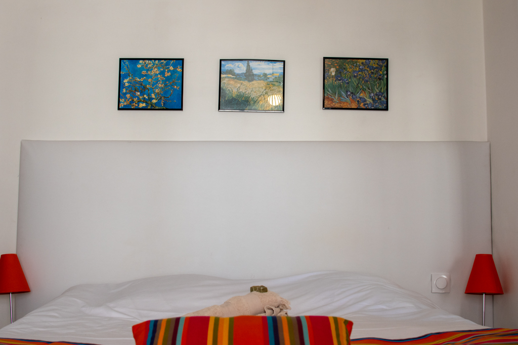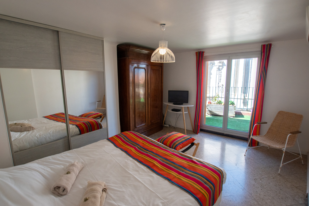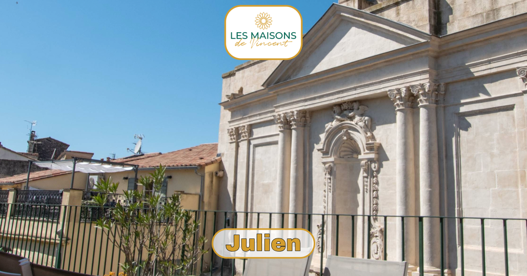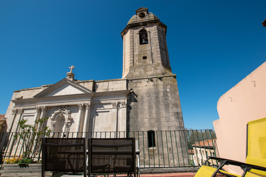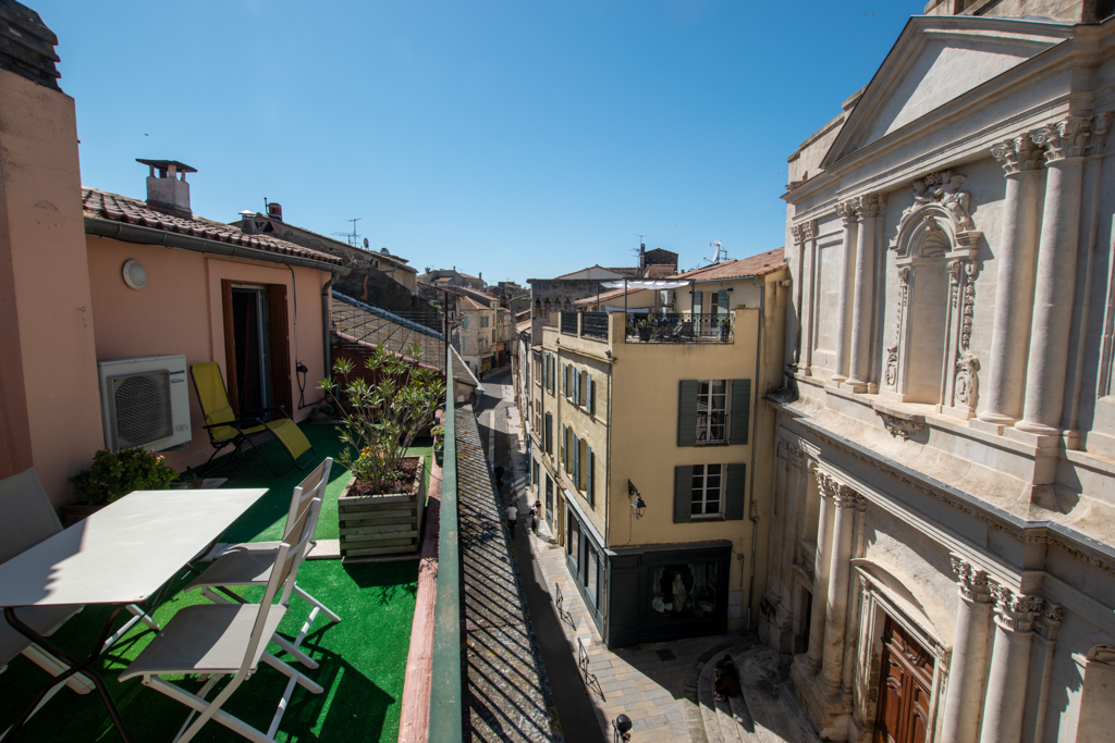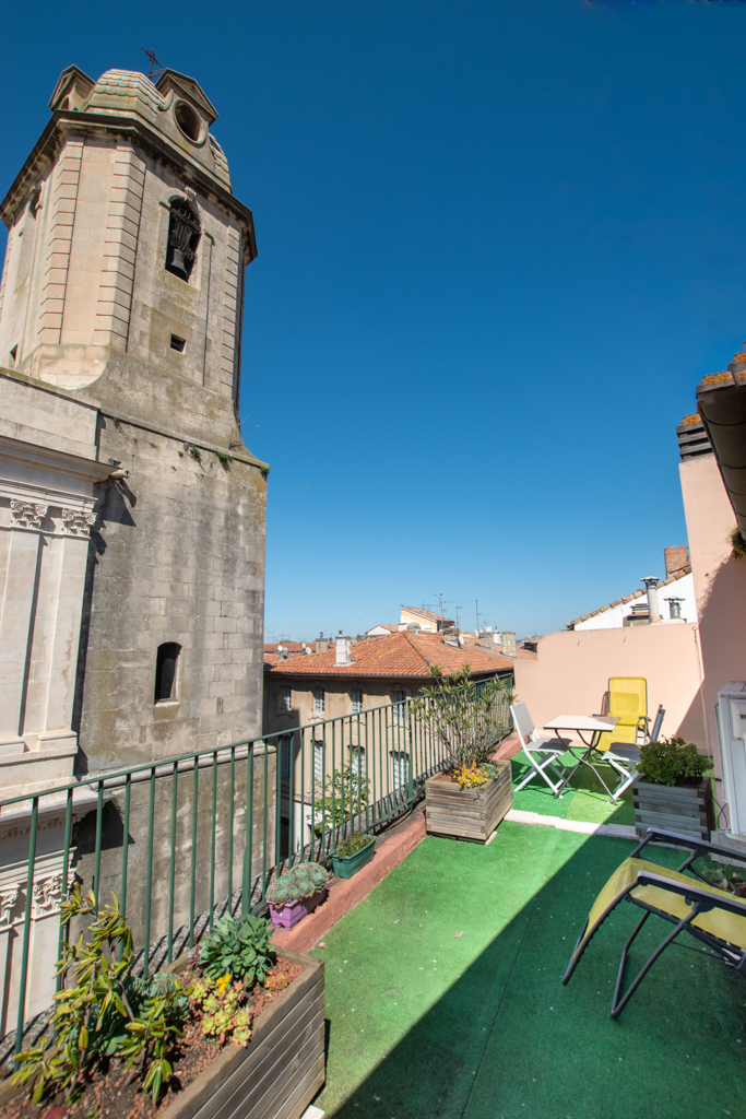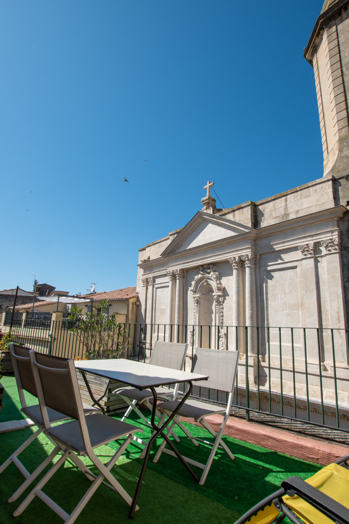 Cet appartement entièrement climatisé, à 2 pas des arènes, niché sur les toits d’Arles dispose surement d’une des terrasses la plus jolie d’Arles: face à l’église St Julien.