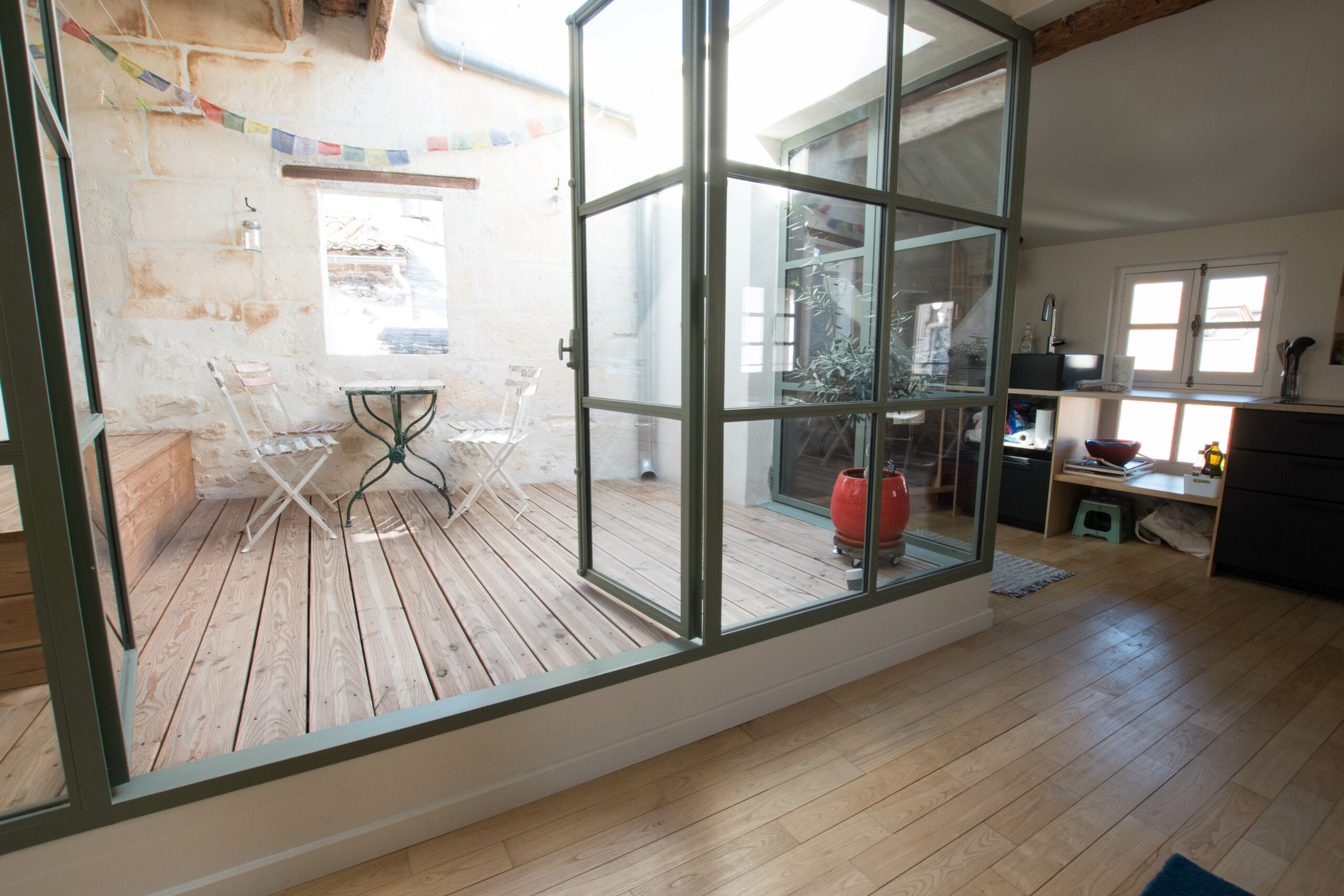 Au deuxième et dernier étage une cuisine ouverte climatisée avec un espace extérieur créée pour profiter de la douceur arlésienne.