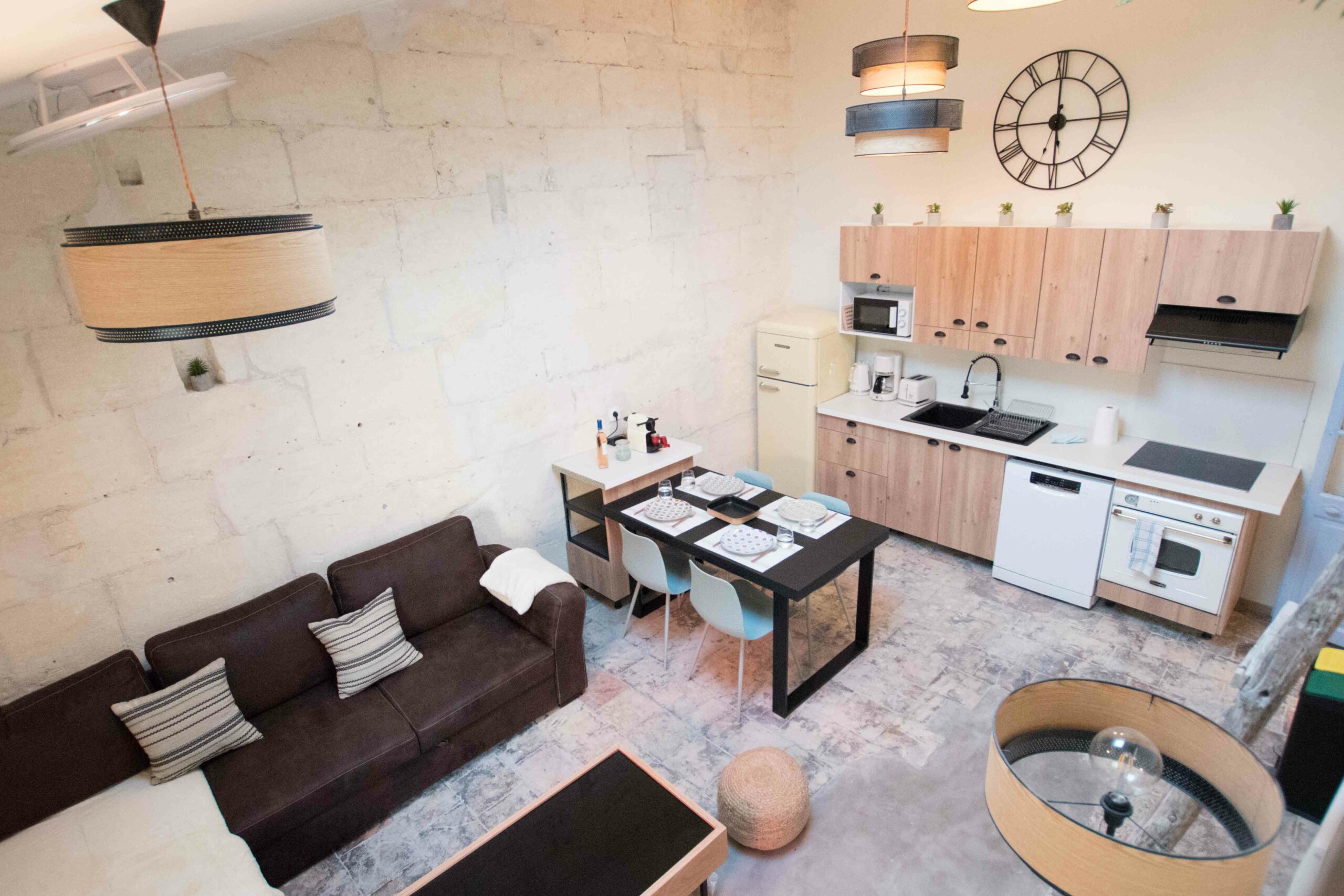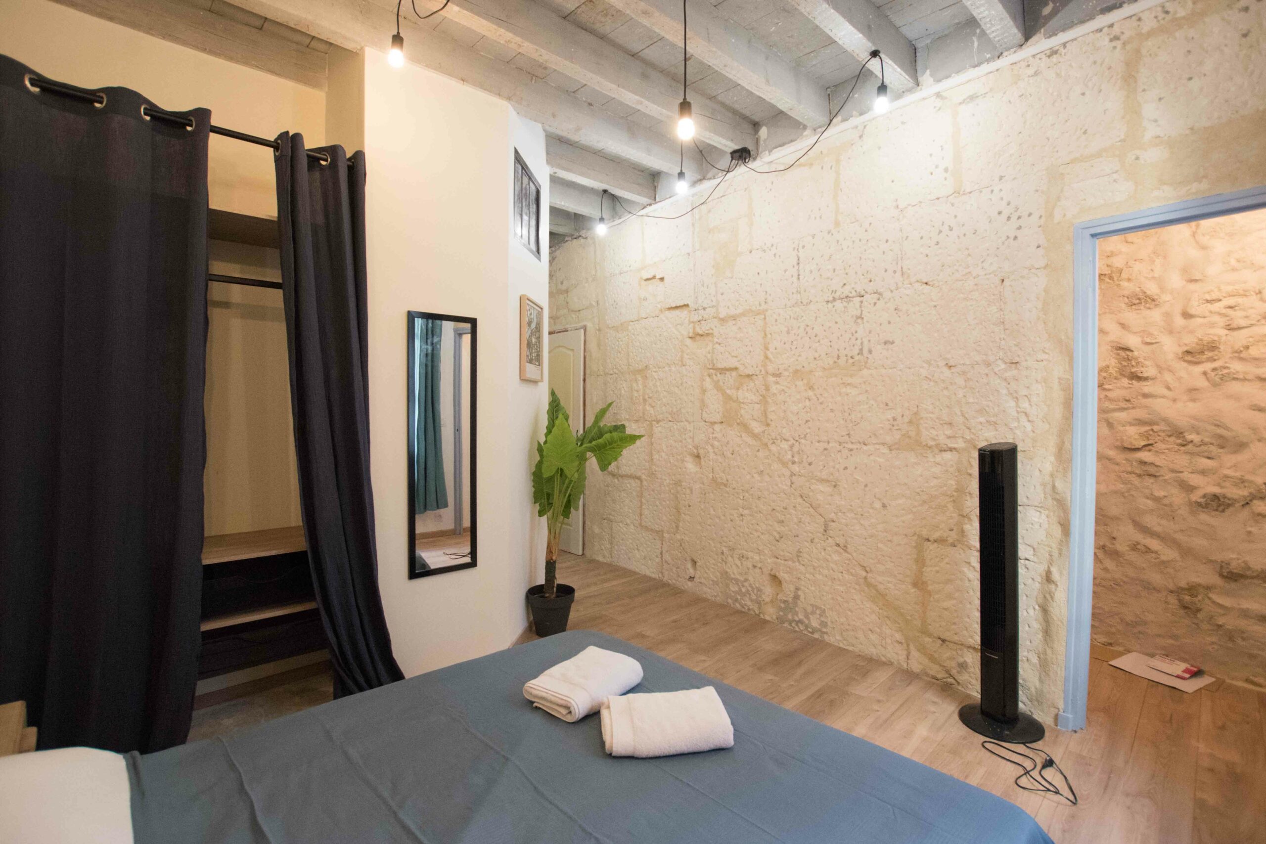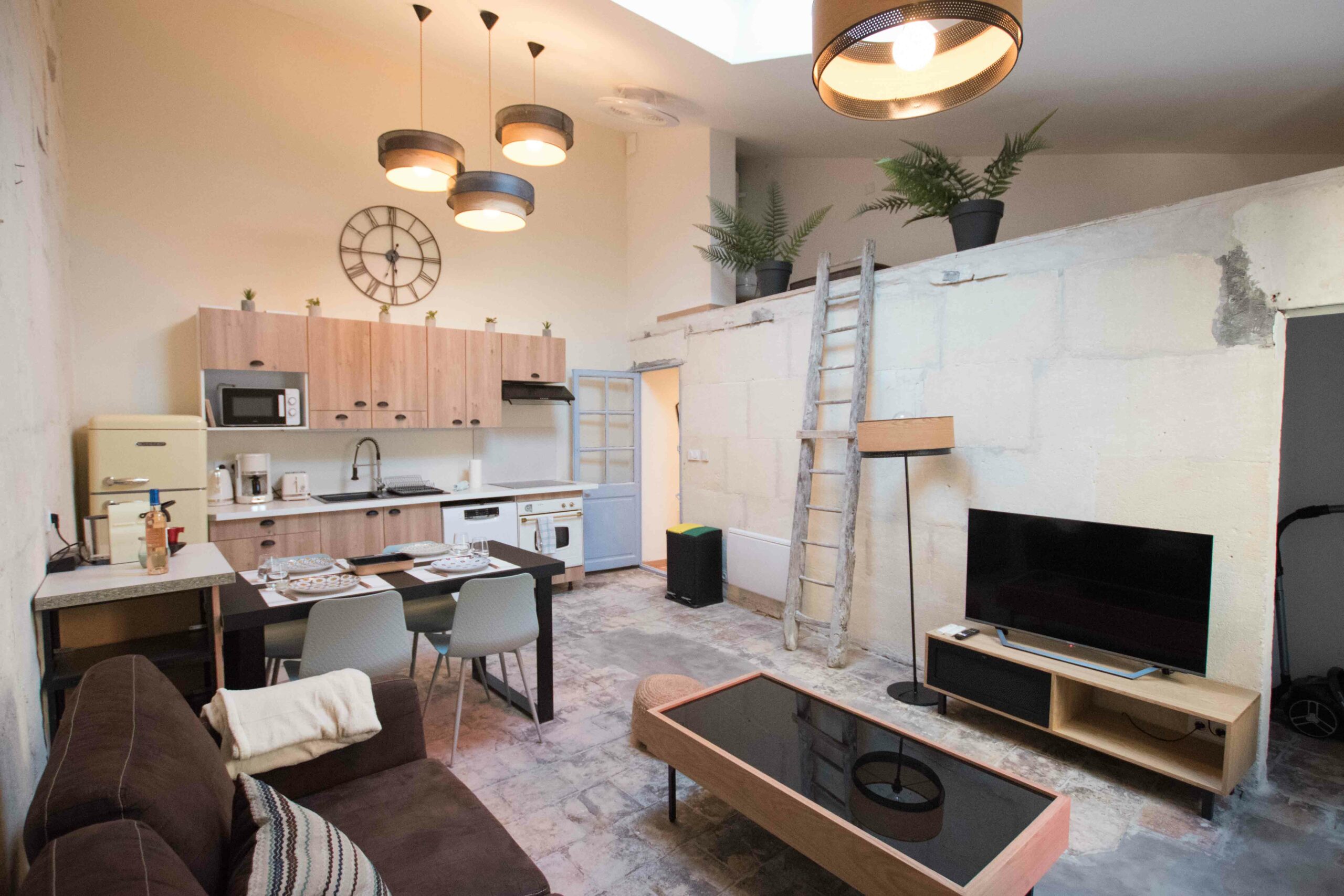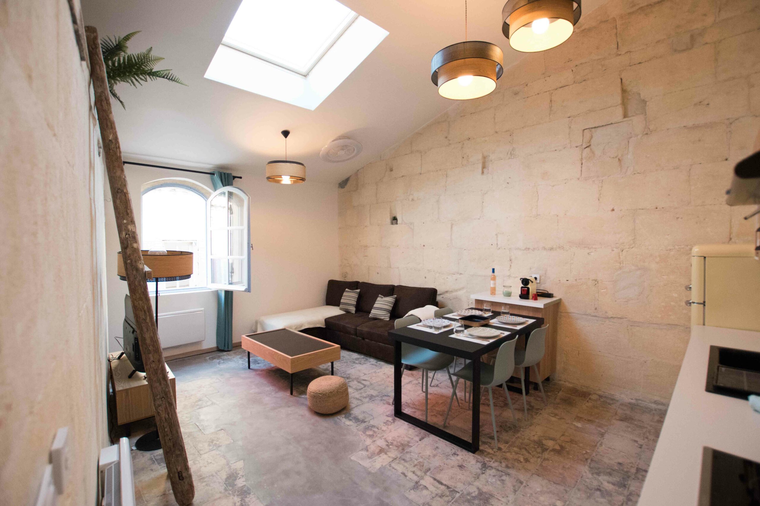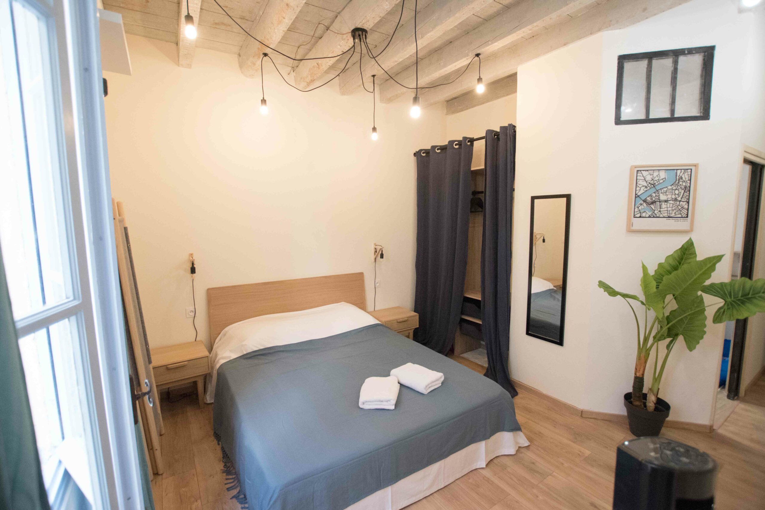 Ce logement en duplex (attention le dernier étage est accessible via un escalier ancien qui est raide) est entièrement climatisé – chambre et salon – mais aussi entièrement équipé (lave linge, cuisine complète…) et joliment décoré.