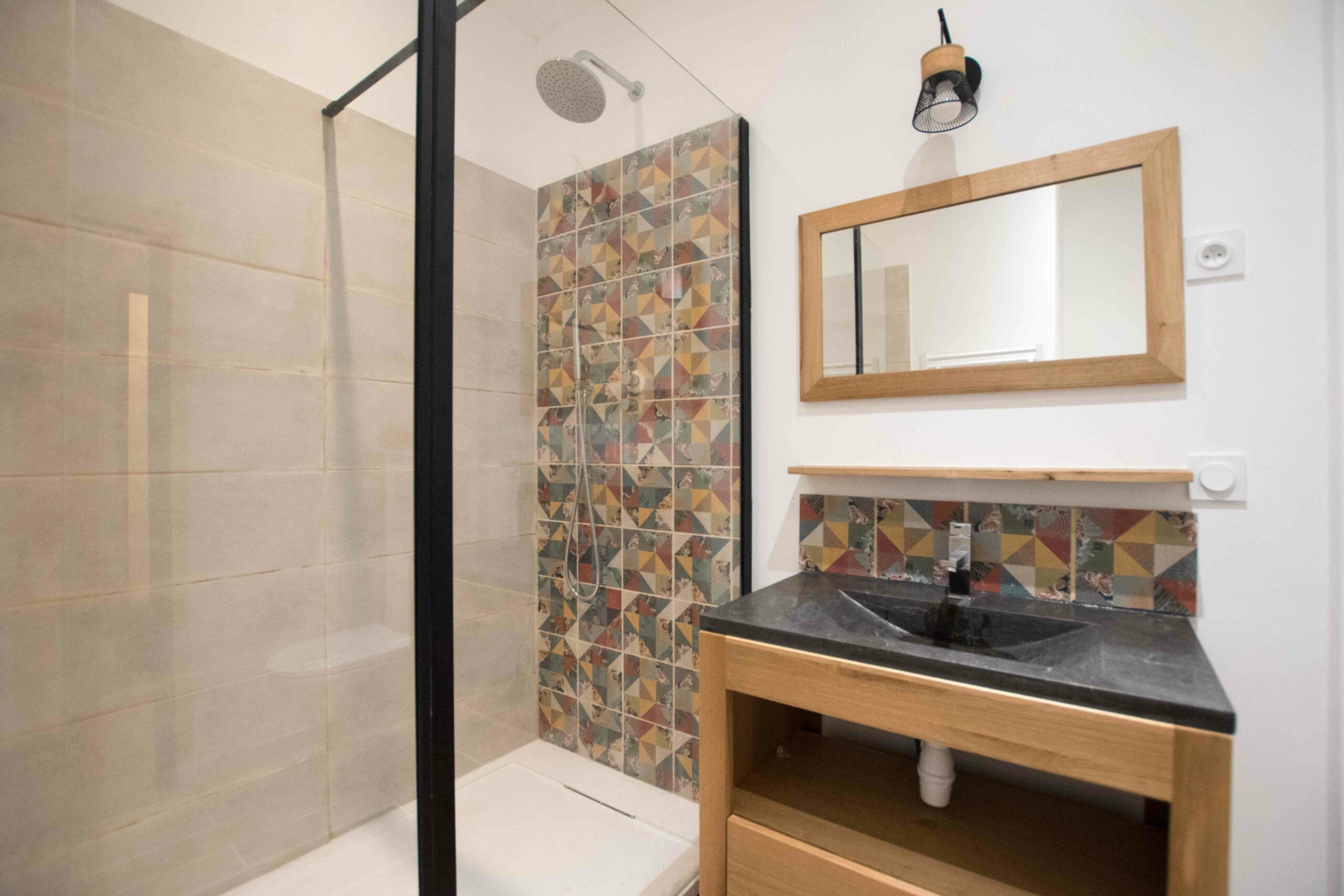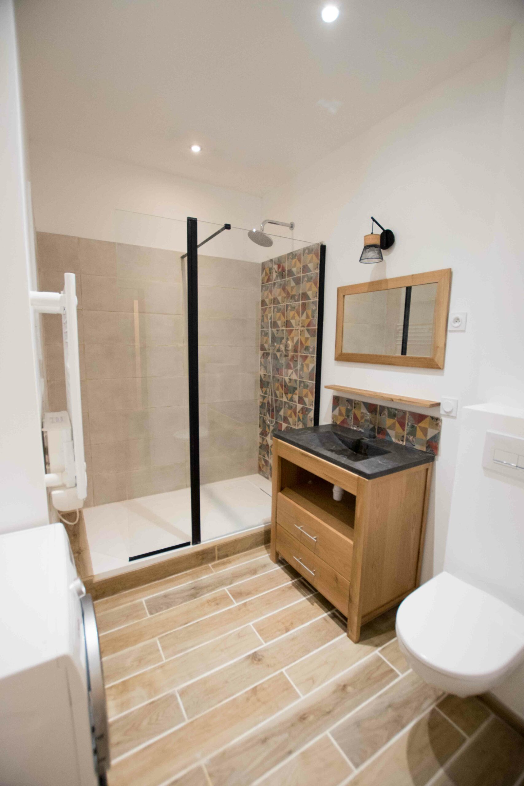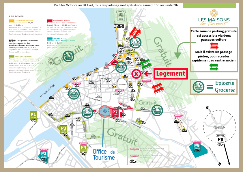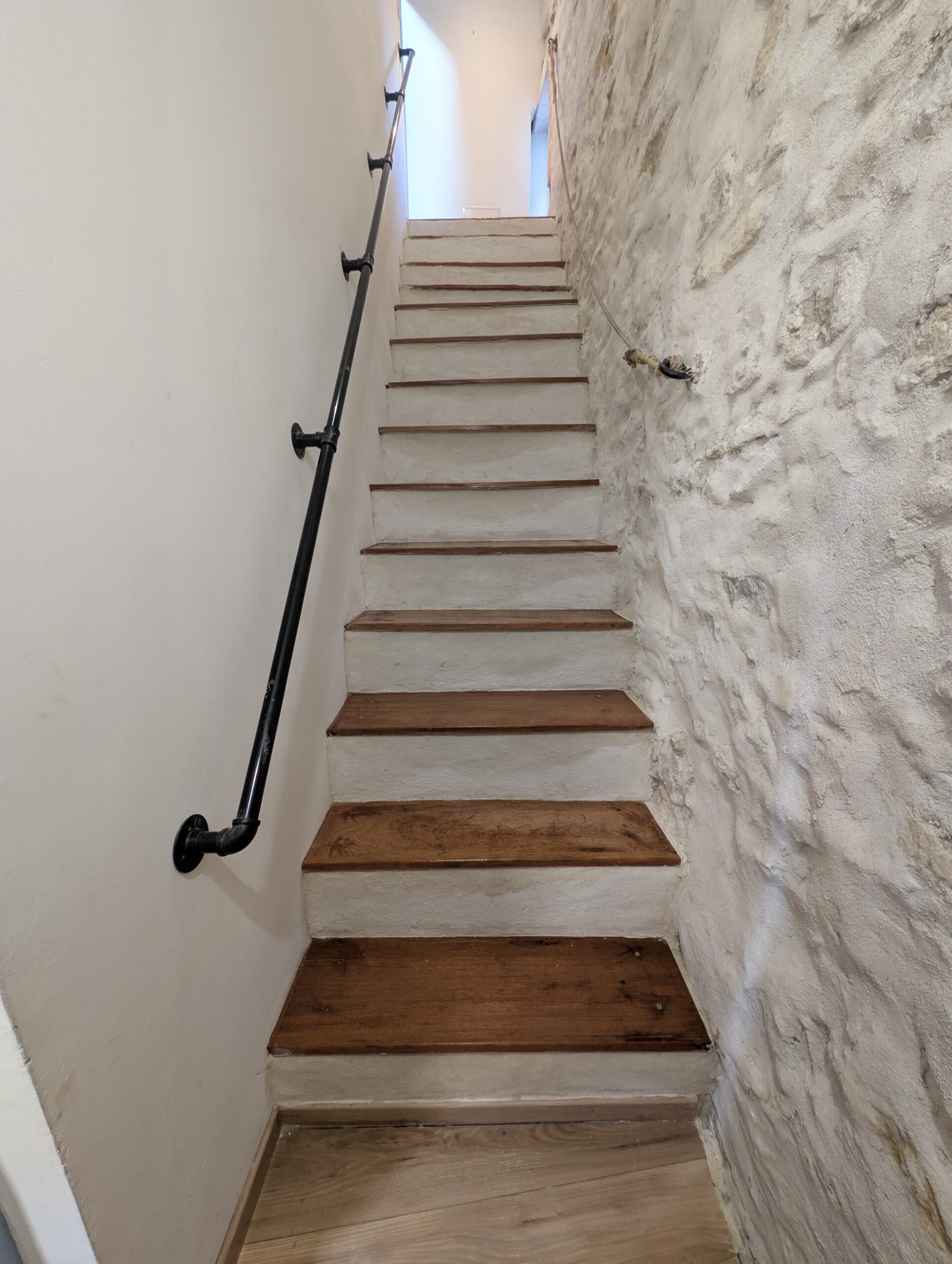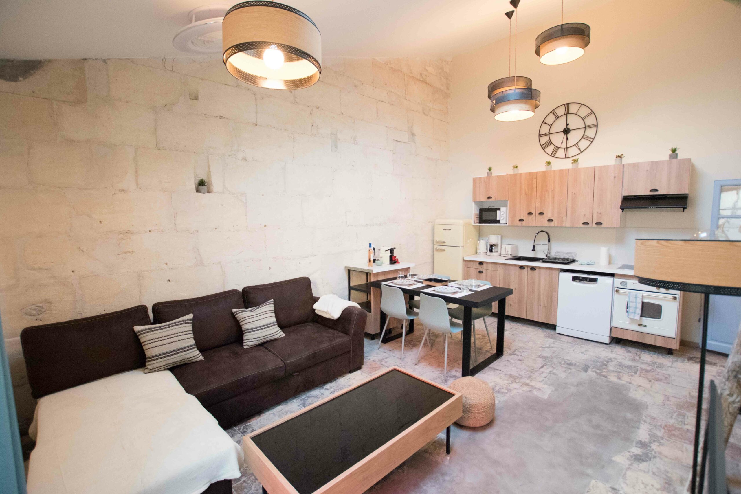 Ce logement en duplex (attention le dernier étage est accessible via un escalier ancien qui est raide) est entièrement climatisé – chambre et salon – mais aussi entièrement équipé (lave linge, cuisine complète…) et joliment décoré.