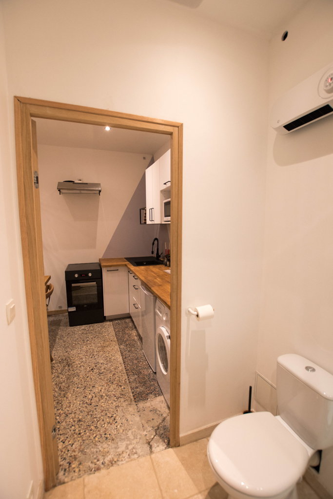 Malgré son prix tout doux, vous aurez dans ce studio tout le confort. Un vrai lit double (pas un canapé inconfortable), une vraie cuisine spacieuse (pas un coin kitchenette) et même une machine à laver !
